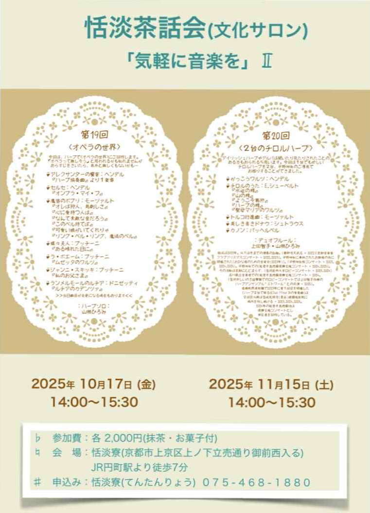 京都 恬淡寮恬淡茶話会(文化サロン) 投稿者: Uedaハープ演奏 11月15日(土)京都 恬淡寮(てんたんりょう)にて初めて、チロルハープでコンサートいたします🎵いつも演奏しているハープとは構造が違い、もちろん音色も違いますチロルハープ2台の演奏なんてなかなか聴けない機会です!14時から15時30分(お抹茶 お菓子付き)2000円です京都、京町の文化サロン初めて伺うので楽しみですチロルハープ どんな音色がするのか晩秋の京都へぜひ聴きにいらして下さいませ