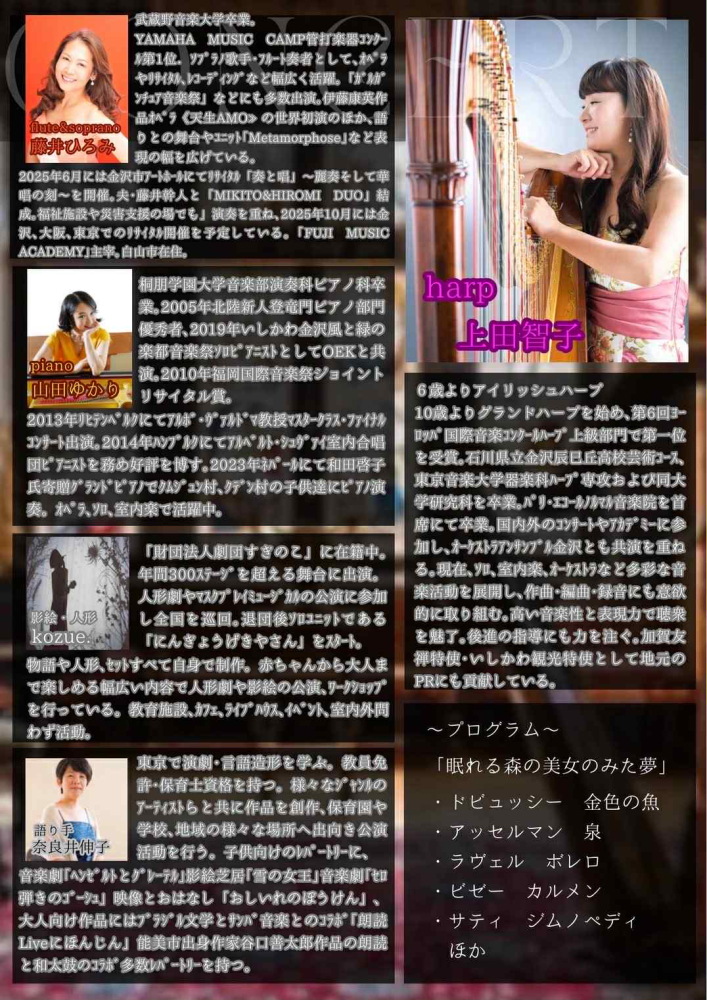 パリへの4年間の留学経験で培った確かな演奏技術を背景に、石川県を代表するハーピスト上田智子が奏でる軽快なフランス音楽にのせて、影絵・人形劇の第一人者Kozueの操る幻想的なファンタジーの世界へと皆さまをお連れします。